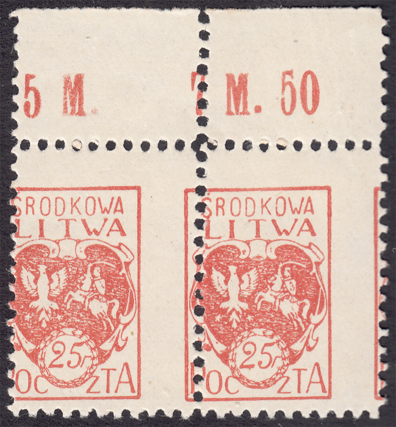 1920 godło Litwy Środkowej, marginesowa parka makulatury znaczka za 25 f. z ogólnie lekko obróconą i mocno przesuniętą w prawo perforacją pionową, bardzo ładny stan zachowania znaczków i gumowania, gwarancja z oznaczeniem (MK) Walocha. | Fi.1B MK Mi.1A |