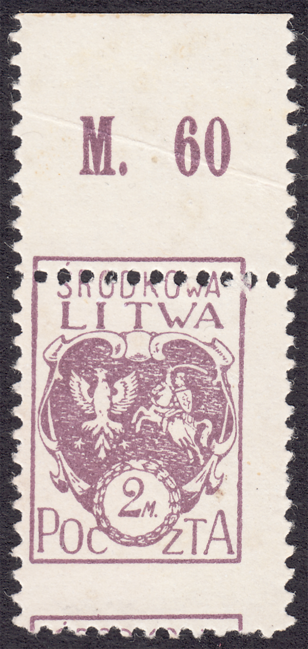 1920 godło Litwy Środkowej, marginesowa makulatura znaczka za 2 Mk. z ogólnie lekko obróconą i mocno przesuniętą w dół perforacją poziomą, bardzo ładny stan zachowania znaczka i gumowania, gwarancja Walocha. | Fi.3B MK Mi.3A |