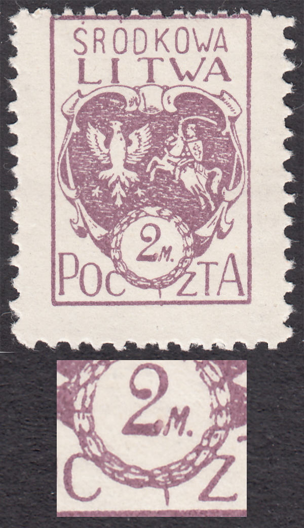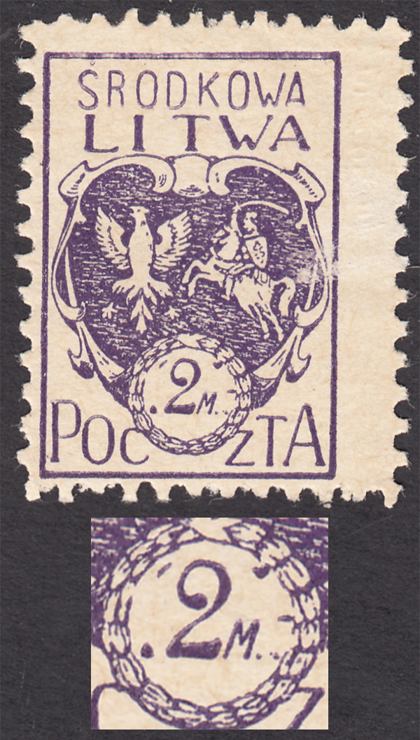 1920 godło Litwy Środkowej, znaczek za 2 mk. z błędem na poz.2 "kropka przed cyfrą 2 i druga po M", bardzo ładny stan zachowania, gwarancja i opis Walocha. | Fi.3B B1 Mi.3A |