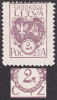 1920 godło Litwy Środkowej, dwie parki prób znaczka za 2 mk., w kolorze ciemnofioletowym na cienkim gładkim papierze - na lewej błąd "kropka przed 2" i w kolorze fioletowym na papierze gazetowym, obie gwarancja i oznaczenie Schmutz. | Fi.3 P2, P3 |
