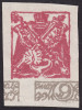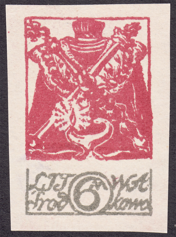 1921 Insygnia Rektorskie, cięty makulaturowy znaczek za 6 mk., z rozsuniętym rysunkiem w poszczególnych kolorach, niegumowany, gwarancja Walocha. | Fi.18A MK Mi.18B |