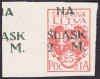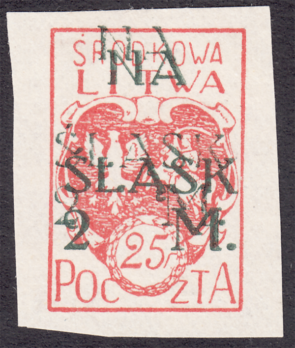 1921 wydanie z dopłatą NA ŚLĄSK, cięty makulaturowy znaczek za 25f.+2mk. z przesuniętym na lewy margines nadrukiem - dość rzadki niekatalogowany błąd, niegumowany, gwarancja Walocha. | Fi.23A MK Mi.23B |