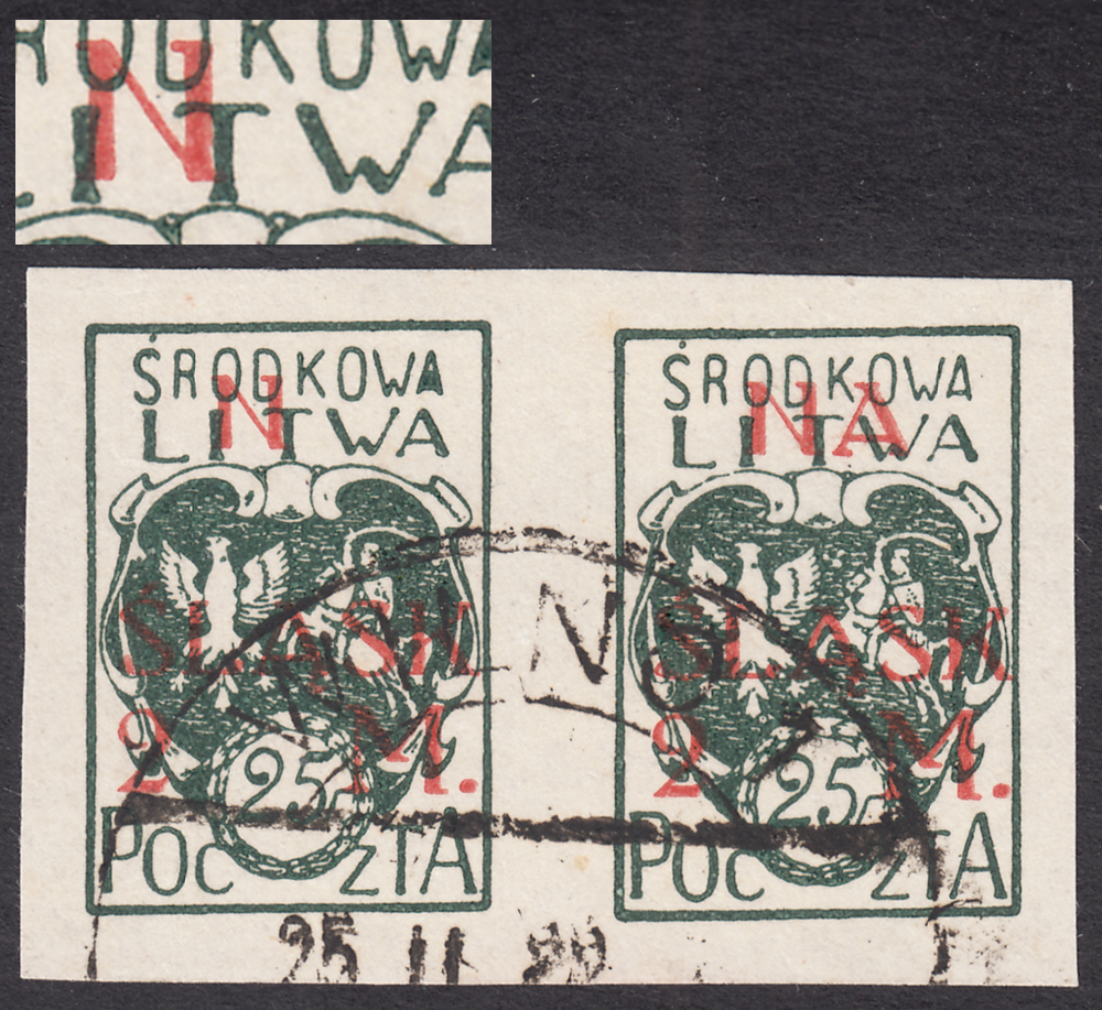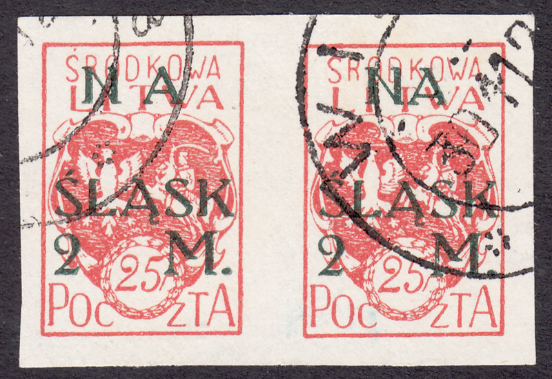 1921 wydanie z dopłatą NA ŚLĄSK, cięta parka kasowanych znaczków za 25f.+2mk., lewy z błędem na poz.27 I formy "brak A w NA", gwarancja i opis Walocha. | Fi.24A B1 Mi.24B |