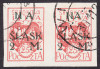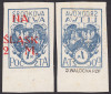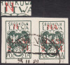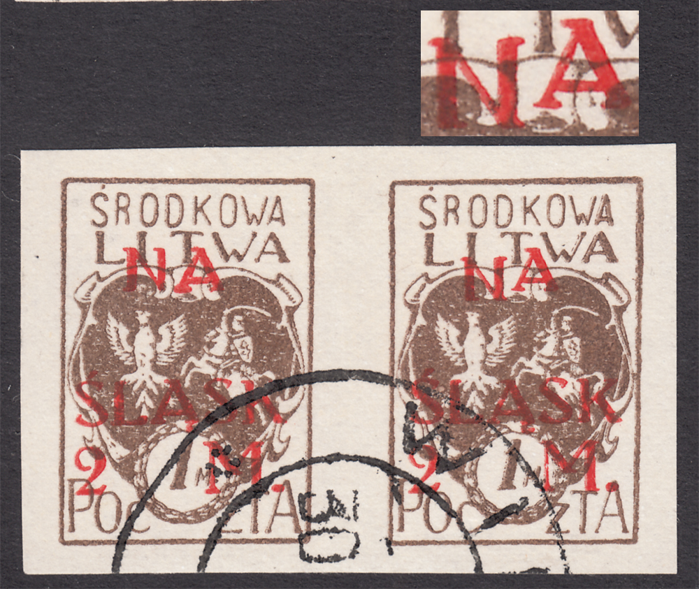 1921 wydanie z dopłatą NA ŚLĄSK, cięta parka kasowanych znaczków za 25f.+2mk., lewy z błędem na poz.78 I formy "odstęp miedzy literami N i A 1,5 zamiast 0,25 mm", gwarancja Walocha. | Fi.23A B3 Mi.23B |