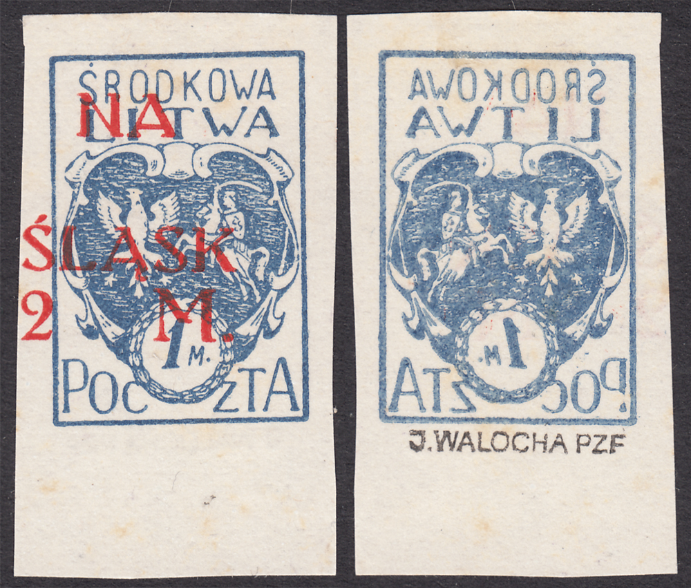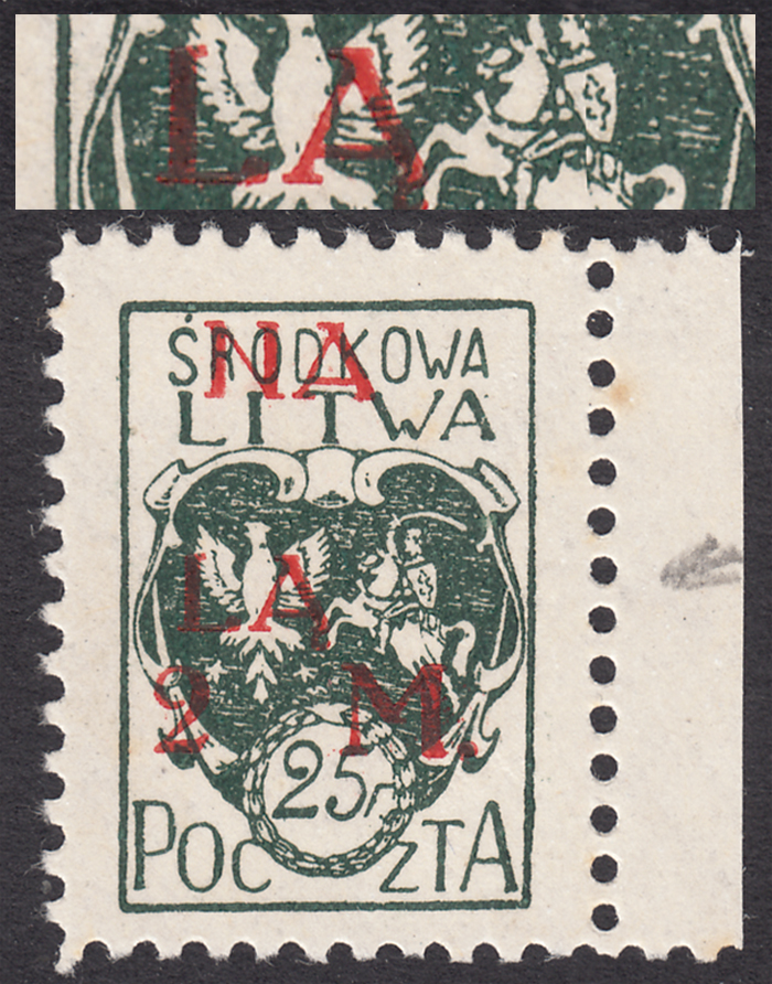 1921 wydanie z dopłatą NA ŚLĄSK, marginesowy znaczek za 25f.+2mk. z niekatalogowanym na tej wartości błędem "LĄ zamiast ŚLĄSK" - błąd ten nie jest dotąd znany w formie I, katalogowany jest na poz.30 II lub III formy na niebieskim znaczku za 1+2 mk., ponieważ forma III była przeznaczona do przedruku 50 znaczkowych arkuszy w położeniu tete-beche, znaczek przedrukowano prawdopodobnie formą II lub błąd pojawił się wcześniej w końcowej fazie przedruku formą I, bardzo ładny stan zachowania, gwarancja Walocha. | Fi.24B B Mi.24A |