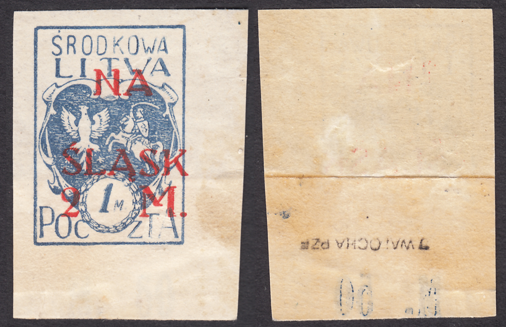 1921 wydanie z dopłatą NA ŚLĄSK, nadruk "NA ŚLĄSK / 2 M." na makulaturze znaczka podstawowego za 1 mk. z pełnym doskonale odbitym "abklatschem", takie odbitki drugostronne są w tym wydaniu rzadkie, gwarancja Walocha. | Fi.25B MK Mi.25A |