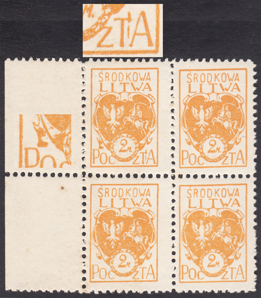 1921 godło Litwy Środkowej, marginesowy czworoblok znaczków za 2 mk., lewy górny z błędami na poz.31 "plama nad PO" i "kreska obok T w POCZTA ", bardzo ładny stan zachowania, gwarancja i opis Walocha. | Fi.22B B8 Mi.22A |