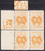 1921 godło Litwy Środkowej, dwa czworobloki makulatury znaczka za 2 mk., pierwszy w kolorze żółtym wydrukowany starannie, drugi w kolorze żółtopomarańczowym z pasami nierówno nałożonej farby na górnych znaczkach - to rzadkie, gwarancja. | Fi.22Aa,b MK Mi.22B |