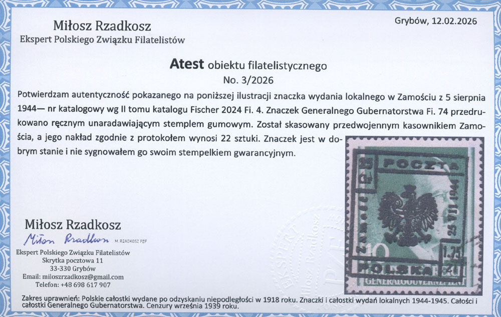 1944 Zamość, stemplowany znaczek z ręcznym nadrukiem lokalnym