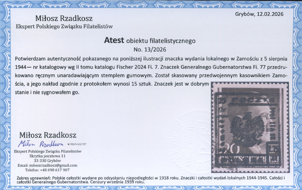1944 Zamość, stemplowany znaczek z ręcznym nadrukiem lokalnym częściowo podwójnie odbitym
