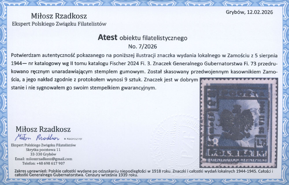 1944 Zamość, stemplowany znaczek z ręcznym nadrukiem lokalnym