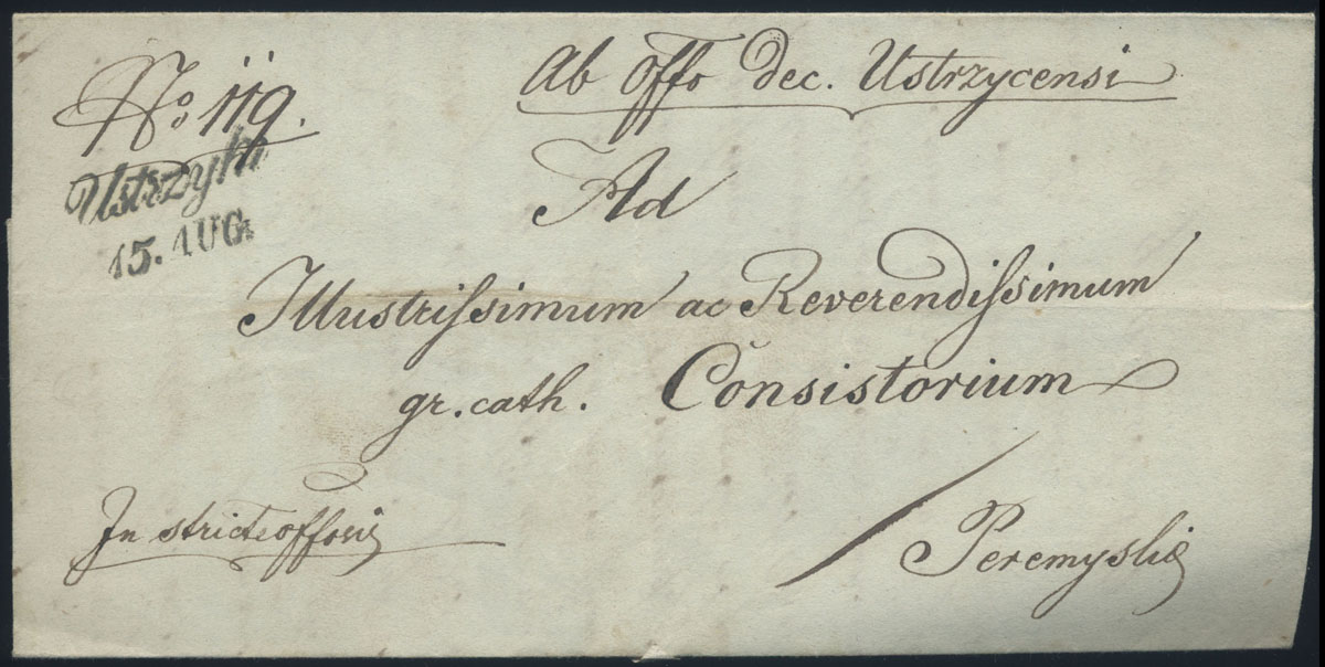 1849 kompletny składany list Ustrzyk do Przemyśla, dopisek "in stricte offosis" zwalniający korespondencję urzędową od opłaty pocztowej. | |