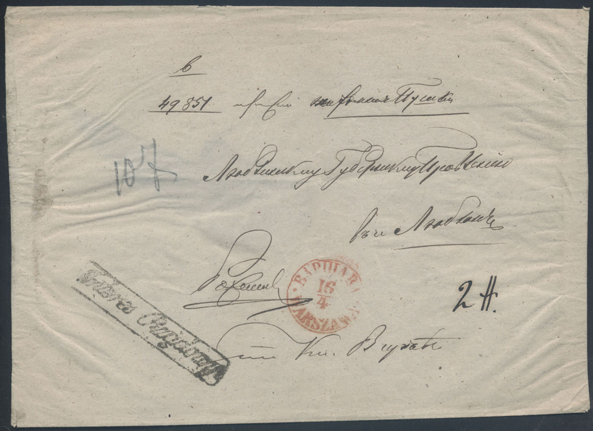 1850 około, list z Warszawy do Lublina, stempel Warszawa typ IXA, stempel "INTERES RZĄDOWY" w ramce. | |