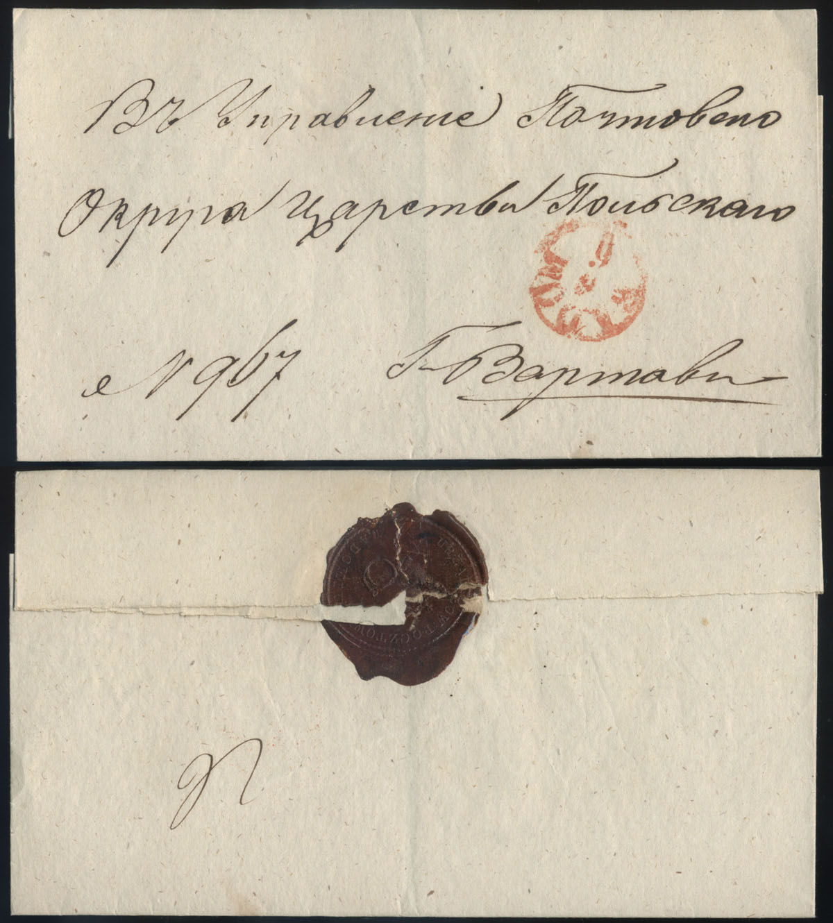 1855 około, WARSZAWA - list wysłany z Warszawy do Kalisza, czerwony stempel nadawczy typu IIIC (śr.24,5 mm), stempelek nadawcy z napisami polsko-rosyjskimi "INTERES RZĄDOWY/ OD RZĄDU GUBER:WARSZ:/ ОТЬ ВАРШ:ГУБ:ПРАВ:" (Czernik typ IIIB) zwalniający korespondencję urzędową od opłaty pocztowej, poniżej faksymile podpisu urzędnika "Majewski"; na odwrocie czytelnie odciśnięta rosyjsko-polska pieczęć nadawcy z orłem "KRÓL: POLSKIE RZĄD GUB: WARSZAWSKI PRZESYŁKA"; walor w bardzo dobrym stanie zachowania. | |