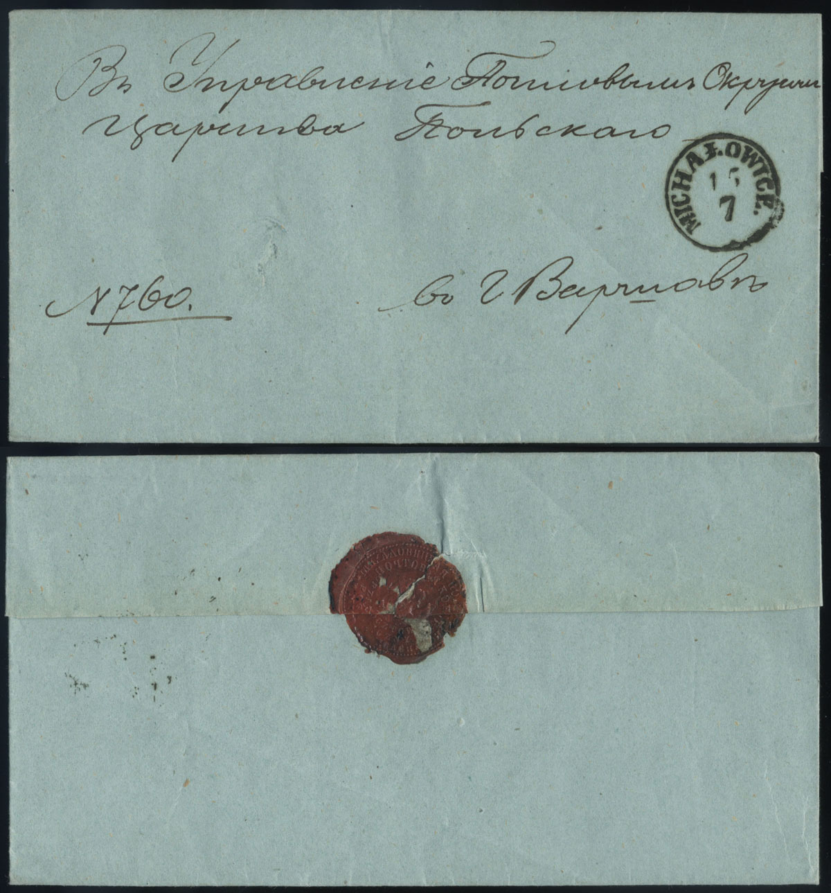 1857 obwoluta listu służbowego z Michałowic do Warszawy, na odwrocie pocztowa pieczęć lakowa urzędu w Michałowicach. | |