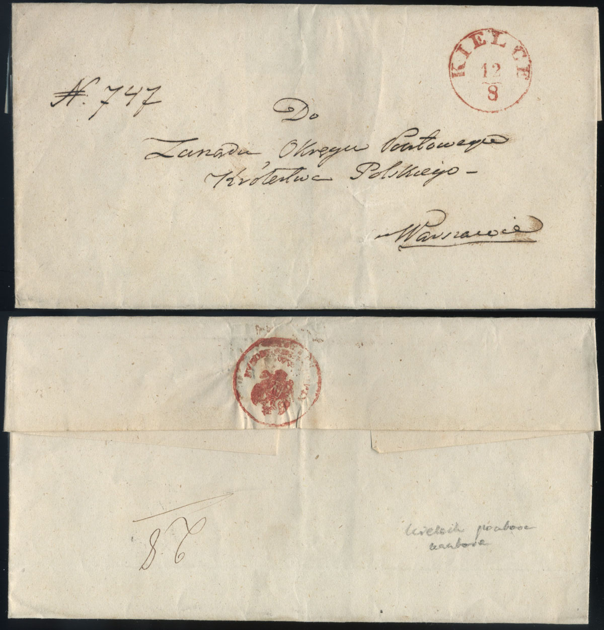 1858 obwoluta listu służbowego z Kielc do Warszawy, na odwrocie pocztowa pieczęć urzędu w Kielcach. | |