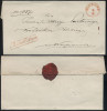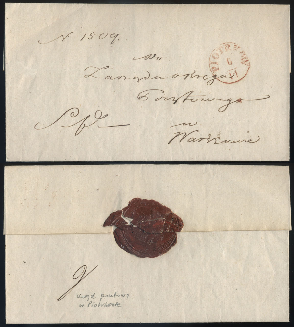 1858 obwoluta listu służbowego z Piotrkowa do Warszawy, na odwrocie pocztowa pieczęć lakowa urzędu w Piotrkowie. | |