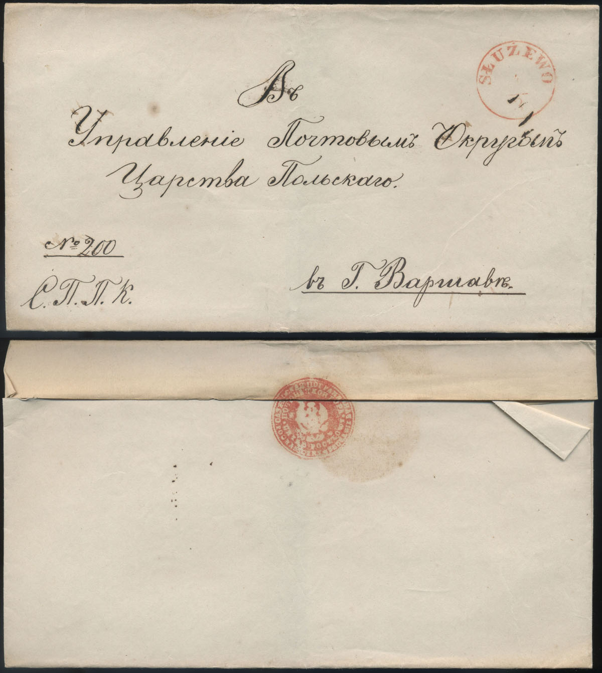 1859 obwoluta listu służbowego z Służewa do Warszawy, stempel "Służba Pocztowa", na odwrocie pocztowa pieczęć lakowa urzędu w Służewie. | |