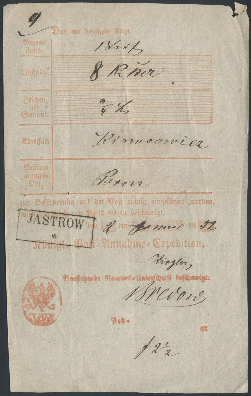 1852 potwierdzenie nadania listu wartościowego z Jastrowia do Poznania. | |