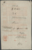 1860 IŁŻA - pokwitowania nadania (kwit) wystawiony 3 sierpnia w miejscowości Iłża "Rejentowi Ok Soleckiego przyjęte na Pocztę do Banku Polskiego w Warszawie" na "Espedycya N 51. z Rublami Sr:657. k 11. sześćset pięćdziesiąt siedm kop iedenastu"; z lewej strony widoczny fragment napisu "POSYŁEK I LISTÓW" znajdujący się na arkuszu, z którego wycinano pokwitowania; rzadki walor w bardzo dobrym stanie zachowania. | |