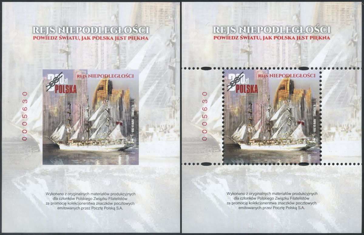 2019 rejs niepodległości, nowodruki wykonane z oryginalnych materiałów produkcyjnych dla członków PZF w nakładzie zaledwie 6.500 egzemplarzy bloków ciętych i perforowanych. | Fi.4949A, B ND |