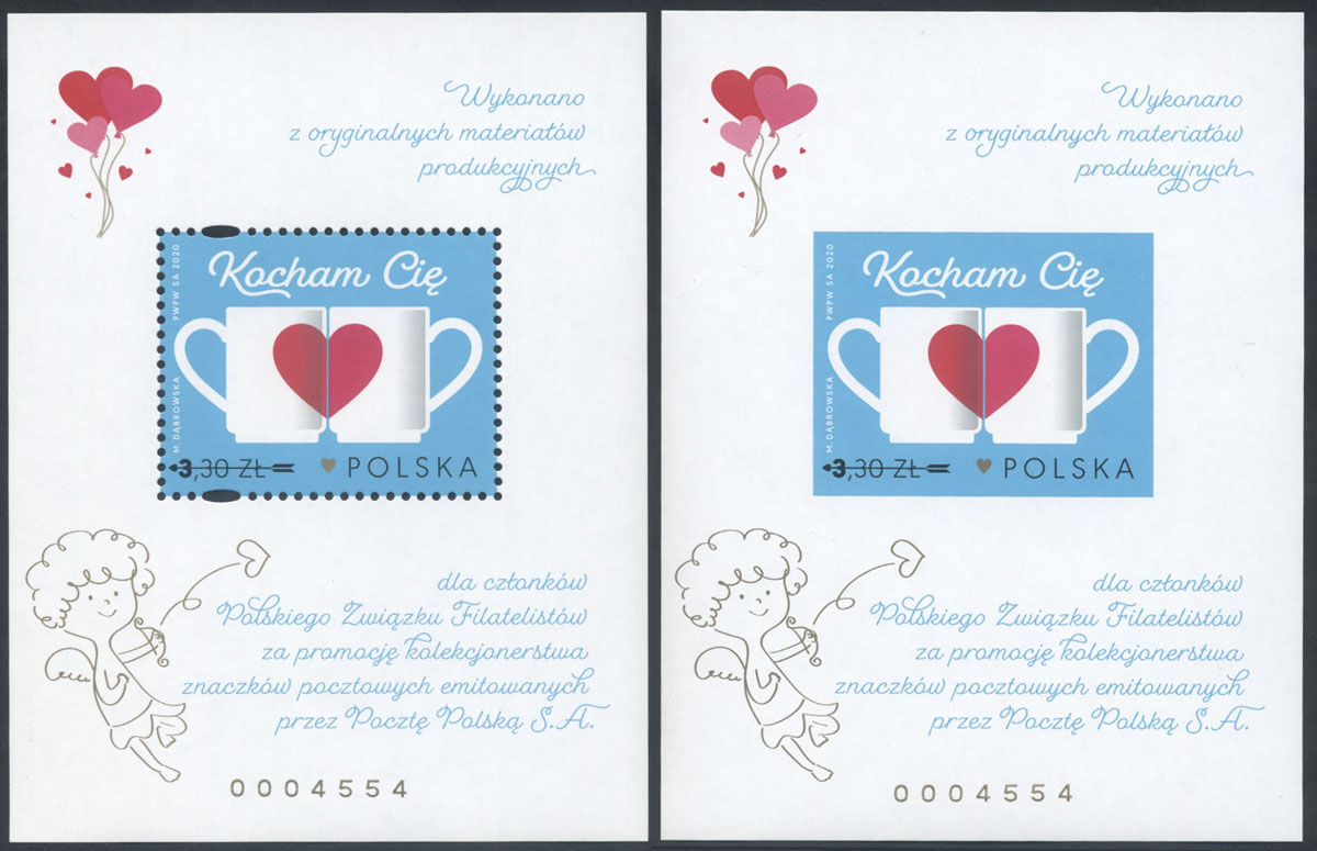 2020 Kocham Cię, nowodruki wykonane z oryginalnych materiałów produkcyjnych dla członków PZF w nakładzie zaledwie 6.500 egzemplarzy bloków ciętych i perforowanych. | Fi.5036A, B ND |