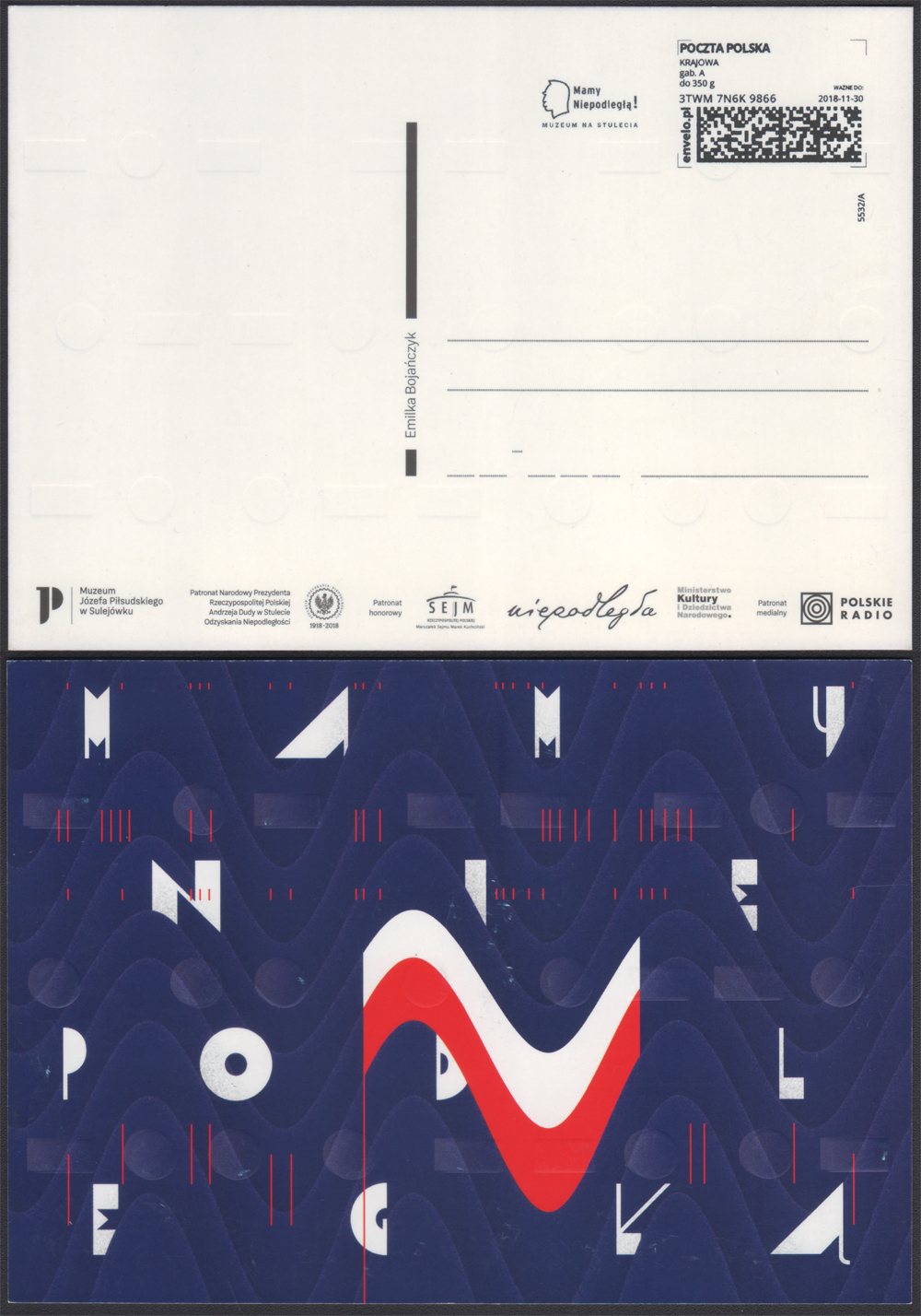 2018 Neokartka z wydrukowanym znakiem opłaty dla przesyłek krajowych, przygotowana z okazji 100 rocznicy odzyskania przez Polskę niepodległości przez Muzeum Józefa Piłsudskiego w Sulejówku; niecodzienny walor w bardzo dobrym stanie zachowania. | |