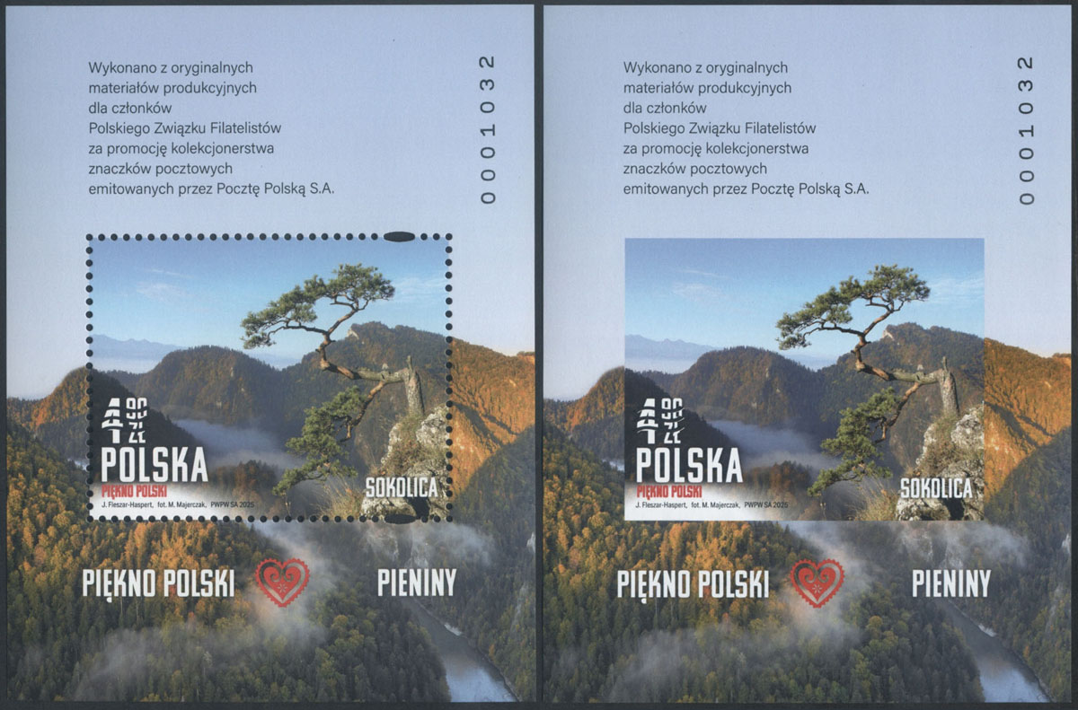 2025 piękno Polski - Sokolica Pieniny, bloczki beznominałowe wykonane przez PWPW dla członków PZF na promocje kolekcjonerstwa w nakładzie po 4000 sztuk. | Fi.5445ND A, B |
