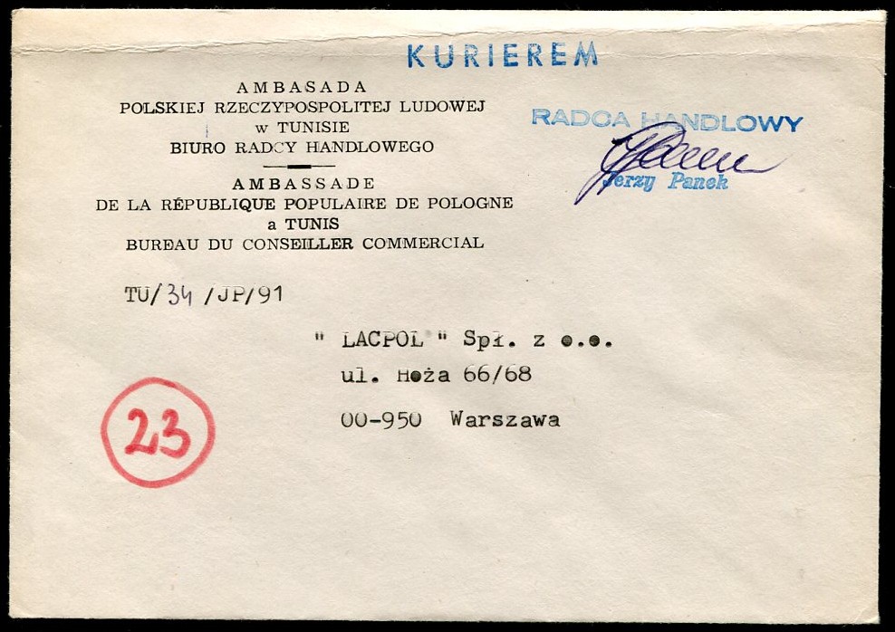 1991 Kurierem, list wysłany pocztą dyplomatyczną z Ambasady Polskiej w Tunisie do Polski. | |