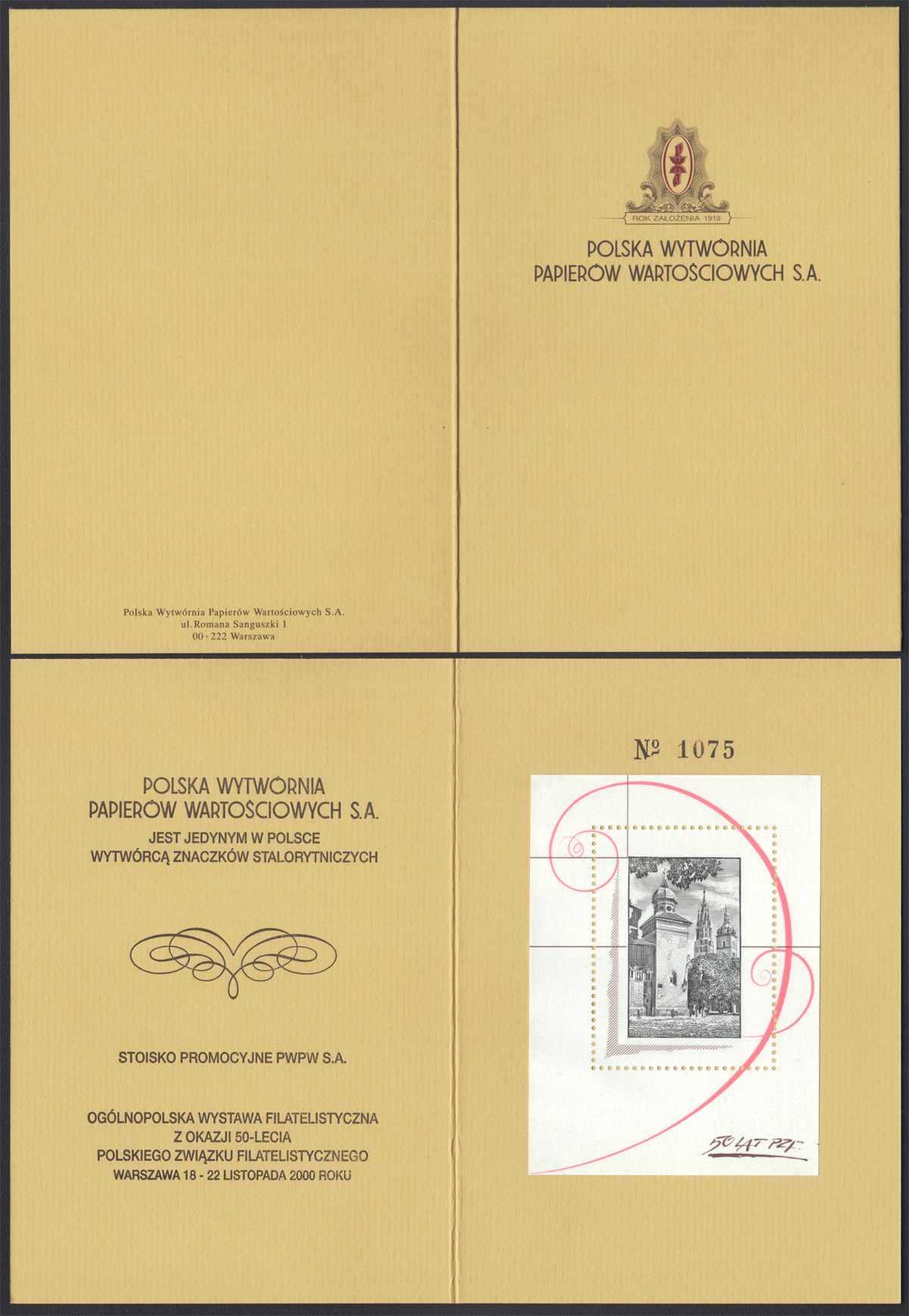 2000 numerowany karnet okolicznościowy z "bloczkiem" wykonanym techniką stalorytu, wydany przez PWPW z okazji 50-lecia Polskiego Związku Filatelistów. | |