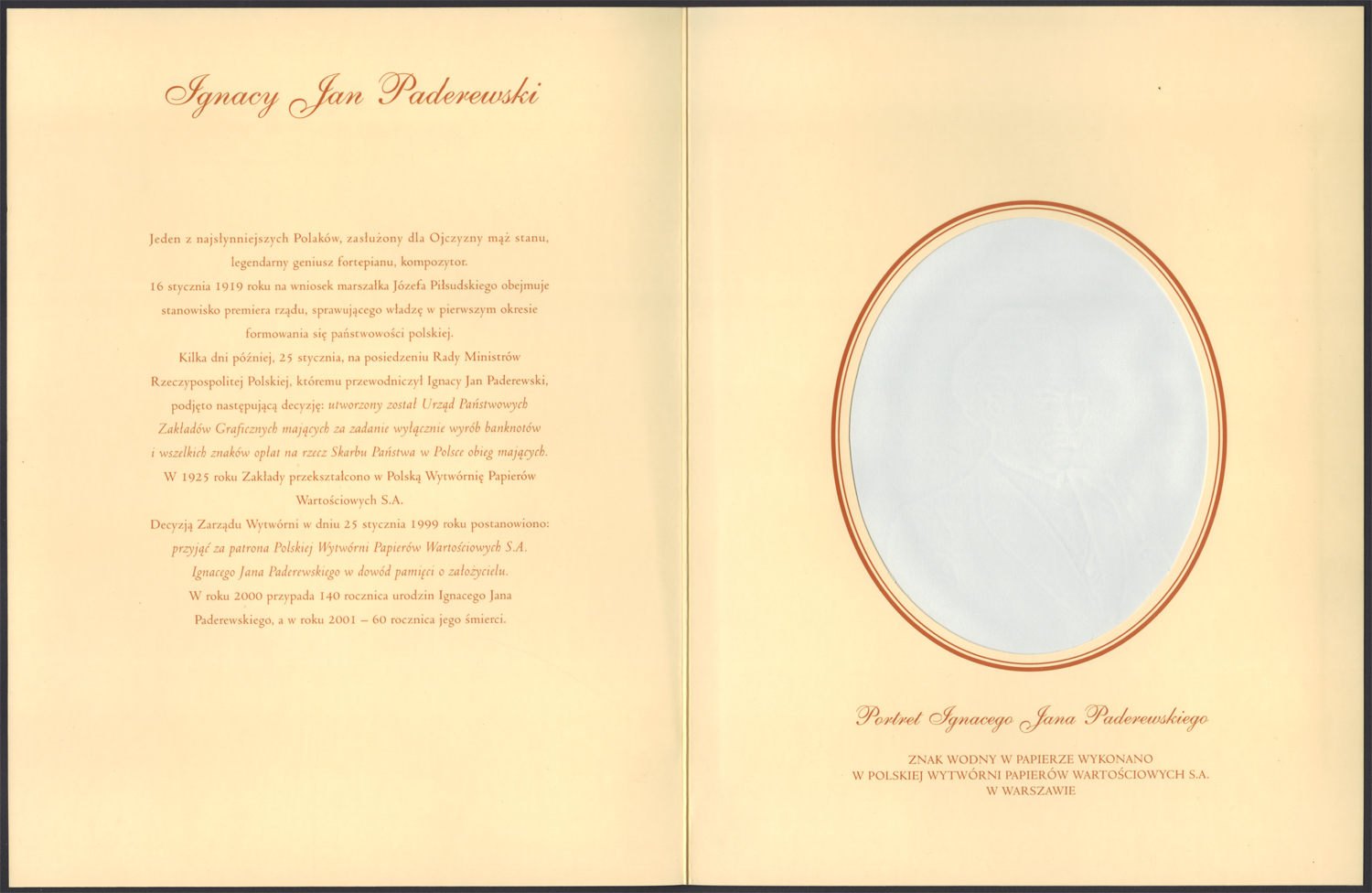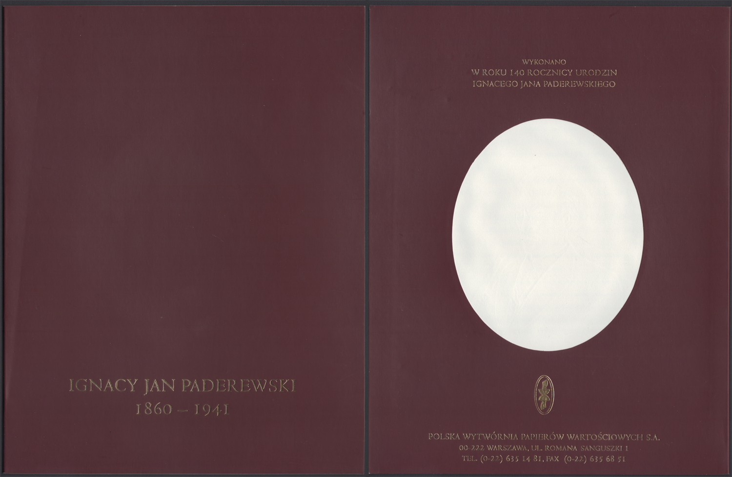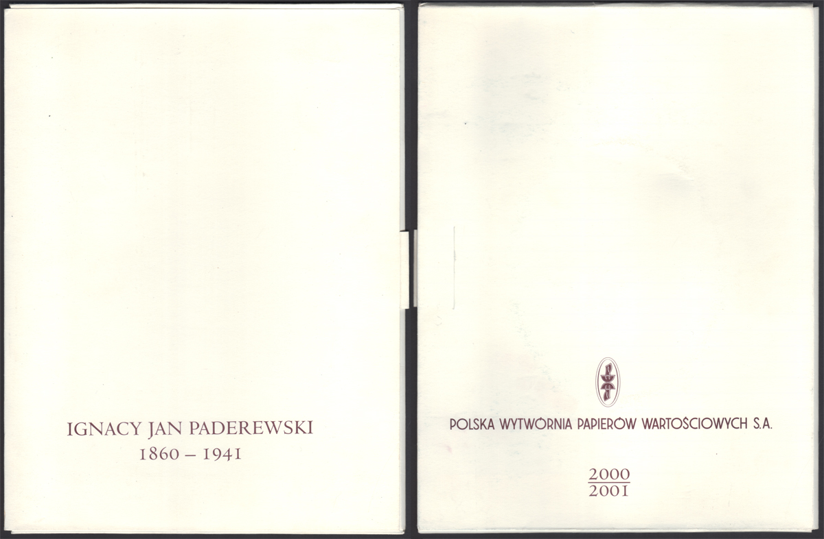 2000 140. rocznica urodzin Józefa Ignacego Paderewskiego - papier ze znakiem wodnym wydrukowany w PWPW umieszczony w ozdobnym folderze z futerałem. | |