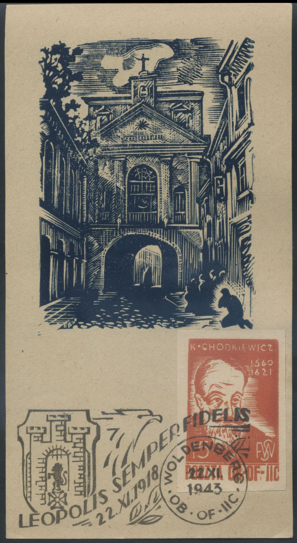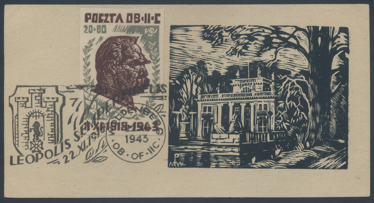 1943 Hetmani, znaczek za 15 f. z Karolem Chodkiewiczem na pocztówce ozdobionej drzeworytem autorstwa Mariana Puchalskiego przedstawiającym cerkiew wołoską we Lwowie, skasowany 22.XI stemplem okolicznościowym "LEOPOLIS SEMPER FIDELIS"; dobry stan zachowania; gwarancja. | Fi.27 |