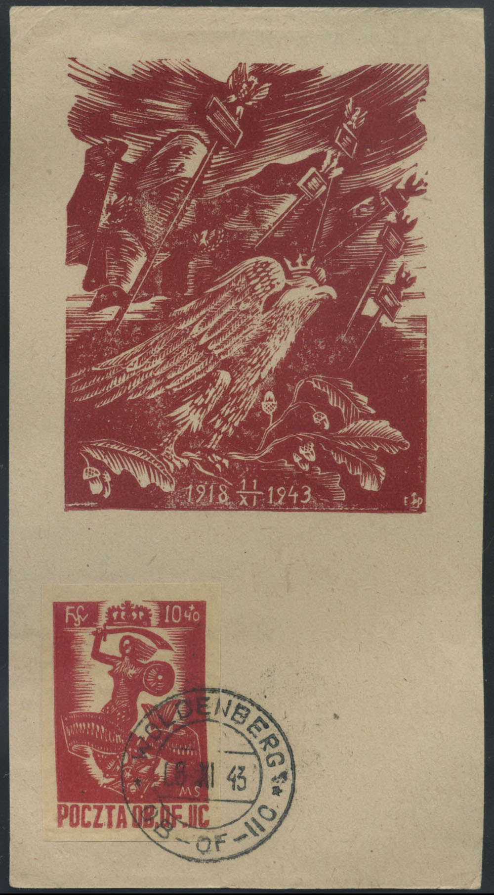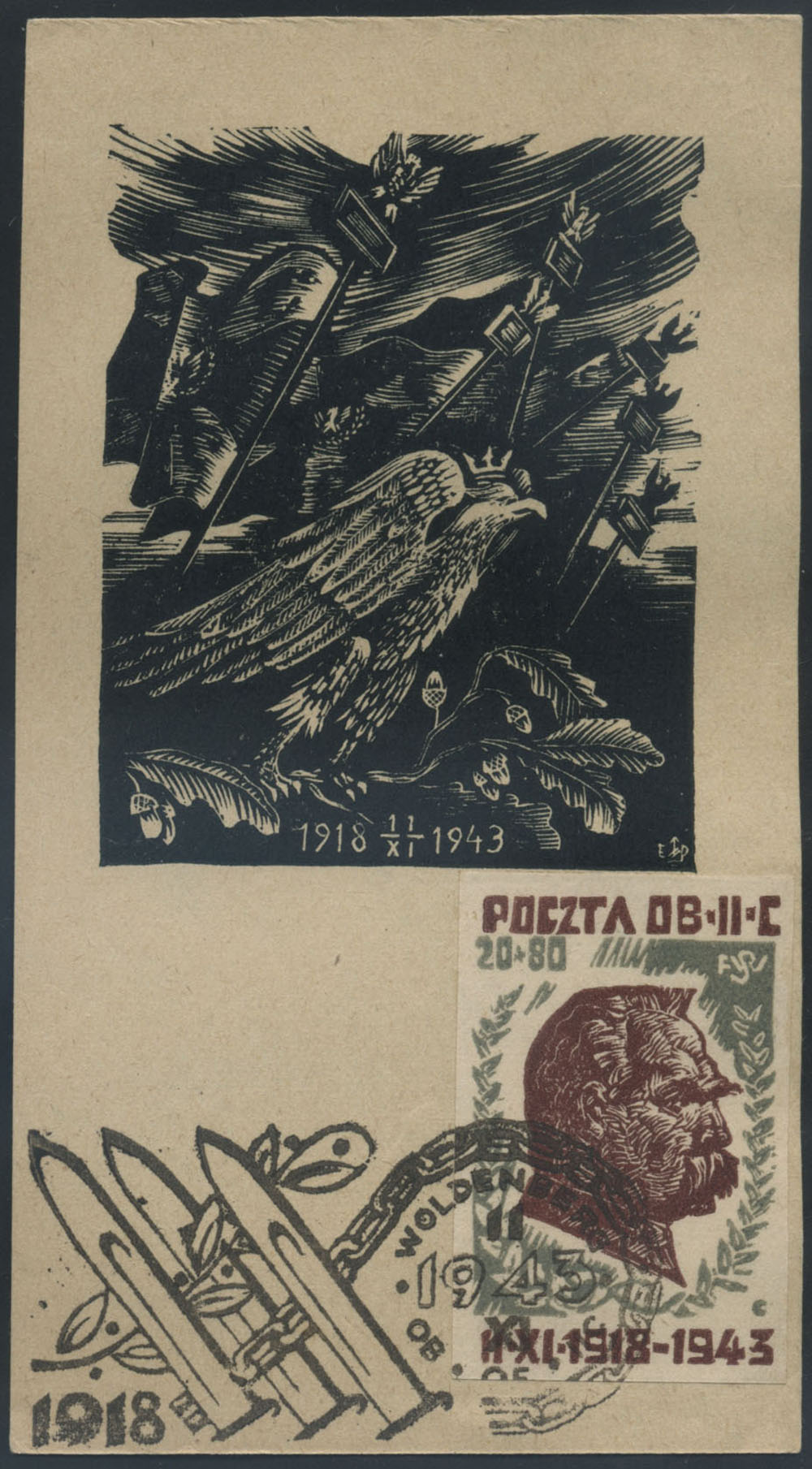 1943 25-lecie odzyskania niepodległości - marszałek Piłsudski, znaczek skasowany okolicznościowo 11.XI. w dniu Święta Niepodległości na pocztówce ozdobionej drzeworytem z patriotycznymi motywami autorstwa Edmunda Pichella, na odwrocie napis "POCZTÓWKA". | Fi.33 |