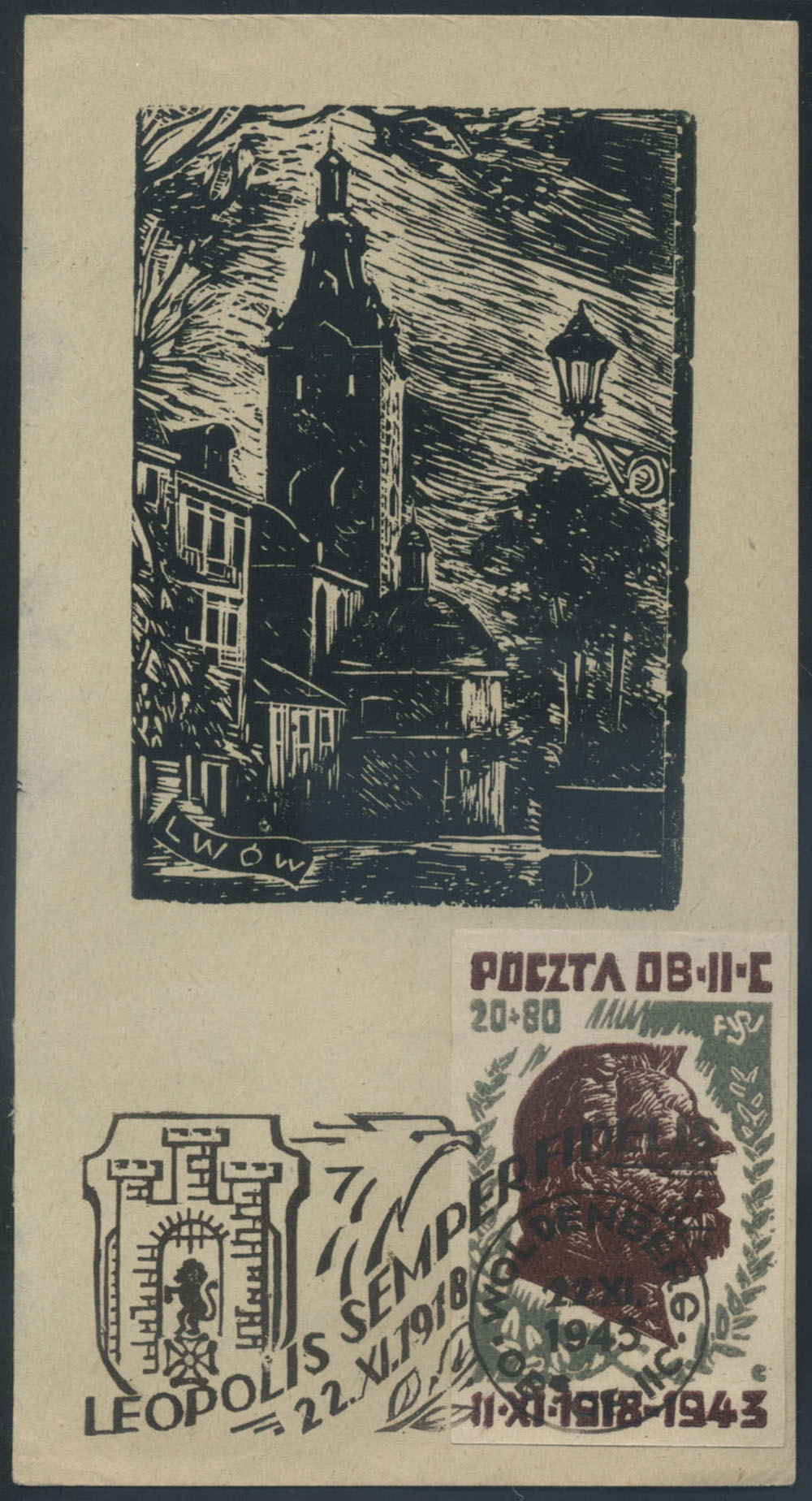 1943 kartka z drzeworytem "Lwów", skasowany stemplem okolicznościowym "LEOPOLIS SEMPER FIDELIS", na odwrocie napis "POCZTÓWKA". | Fi.33 |