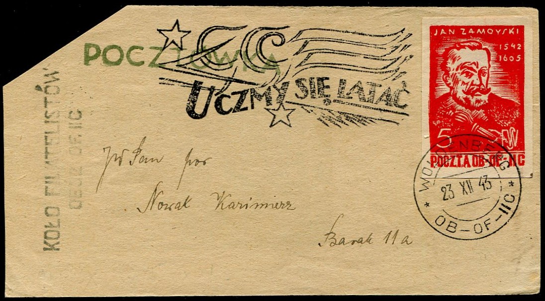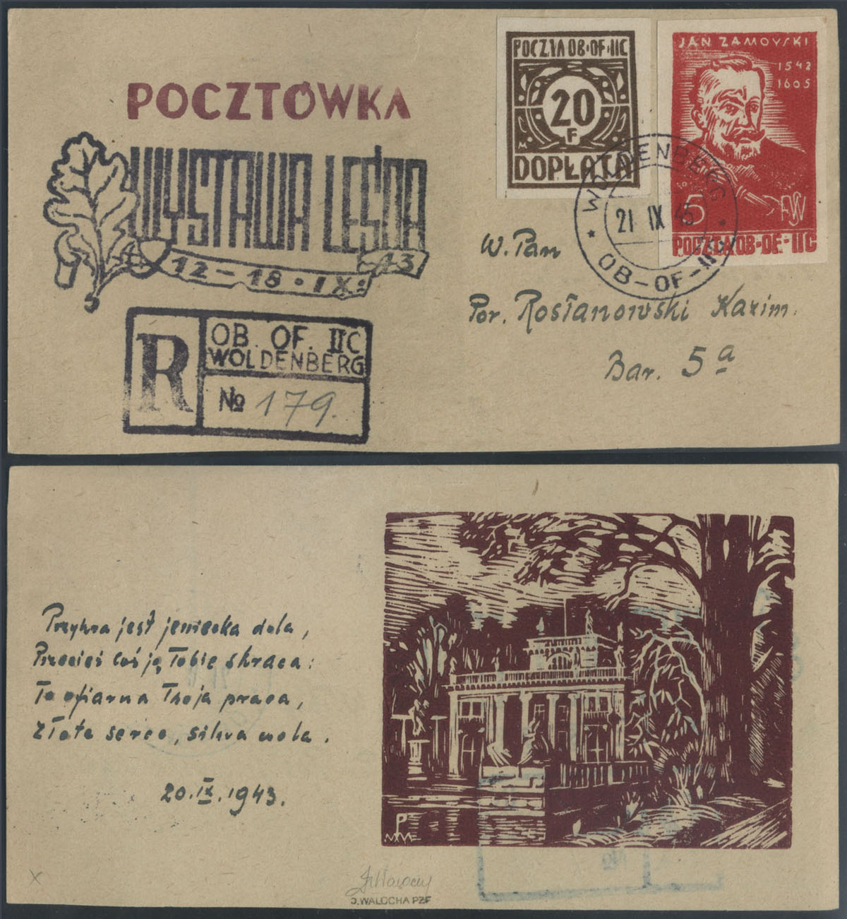 1943 kartka polecona opłacona znaczkiem opłaty i dopłaty, stempel okolicznościowy Wystawy leśnej, gwarancja na odwrocie Walocha. | Fi.23, D4 |
