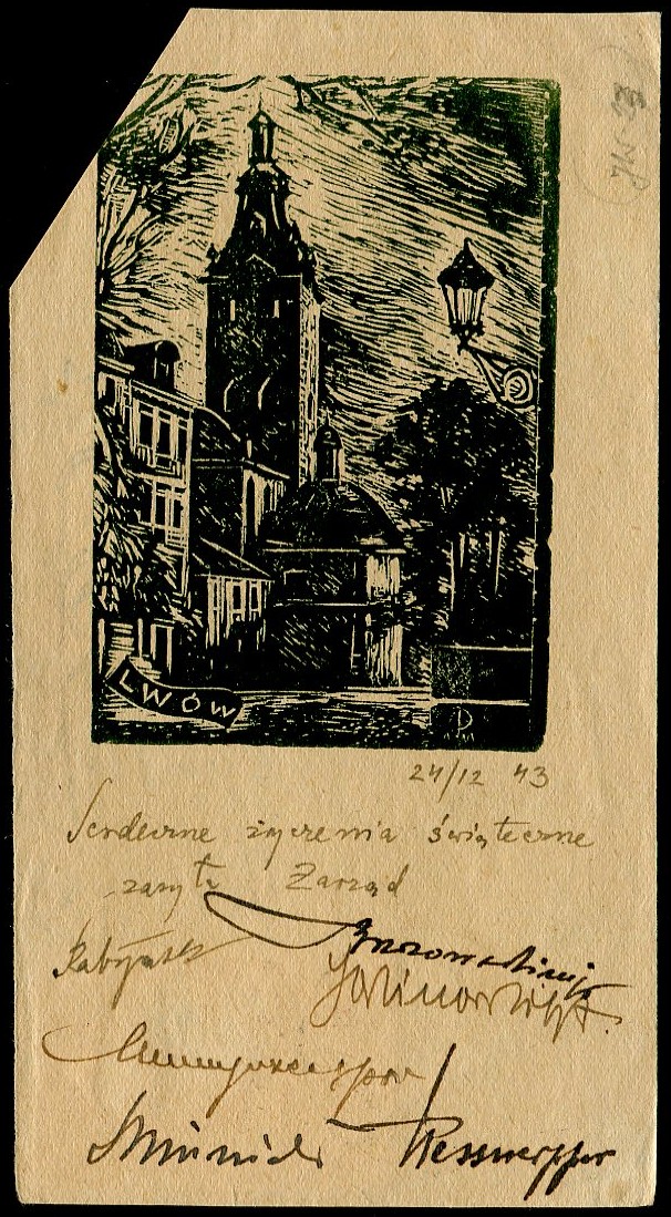 1943 list, ozdobna pocztówka z naklejonym znaczkiem Zamoyskiego, koła filatelistów, z tyłu drzeworyt Lwowa, życzenia świąteczne wraz z podpisami członków Zarządu Koła. | Fi.23 |