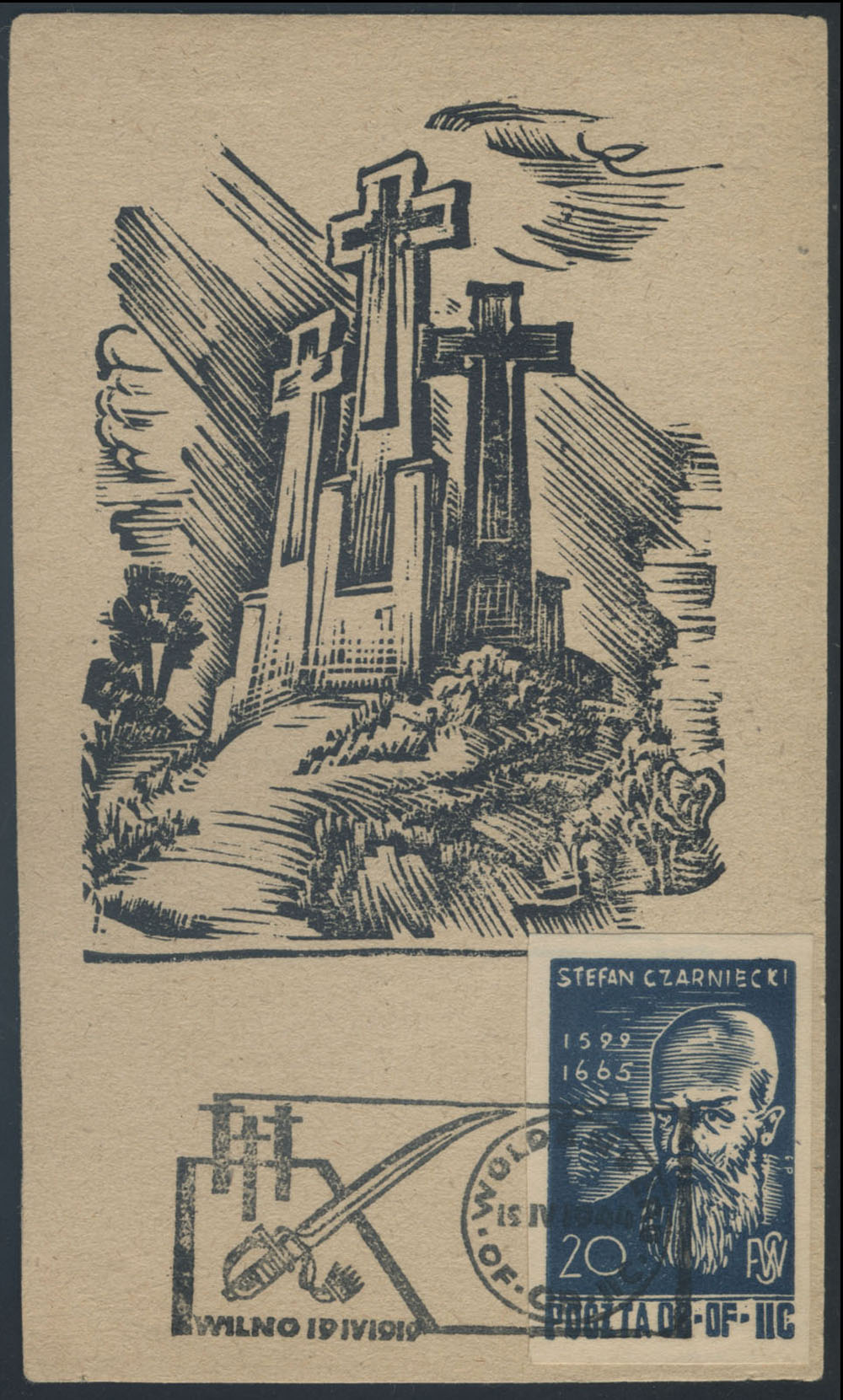 1944 karta ozdobiona drzeworytem przedstawiającym Górę Trzykrzyską w Wilnie, ostemplowana okolicznościowo 19.IV. kasownikiem "WILNO 19IV1919", na odwrocie napis POCZTÓWKA. | Fi.28 |