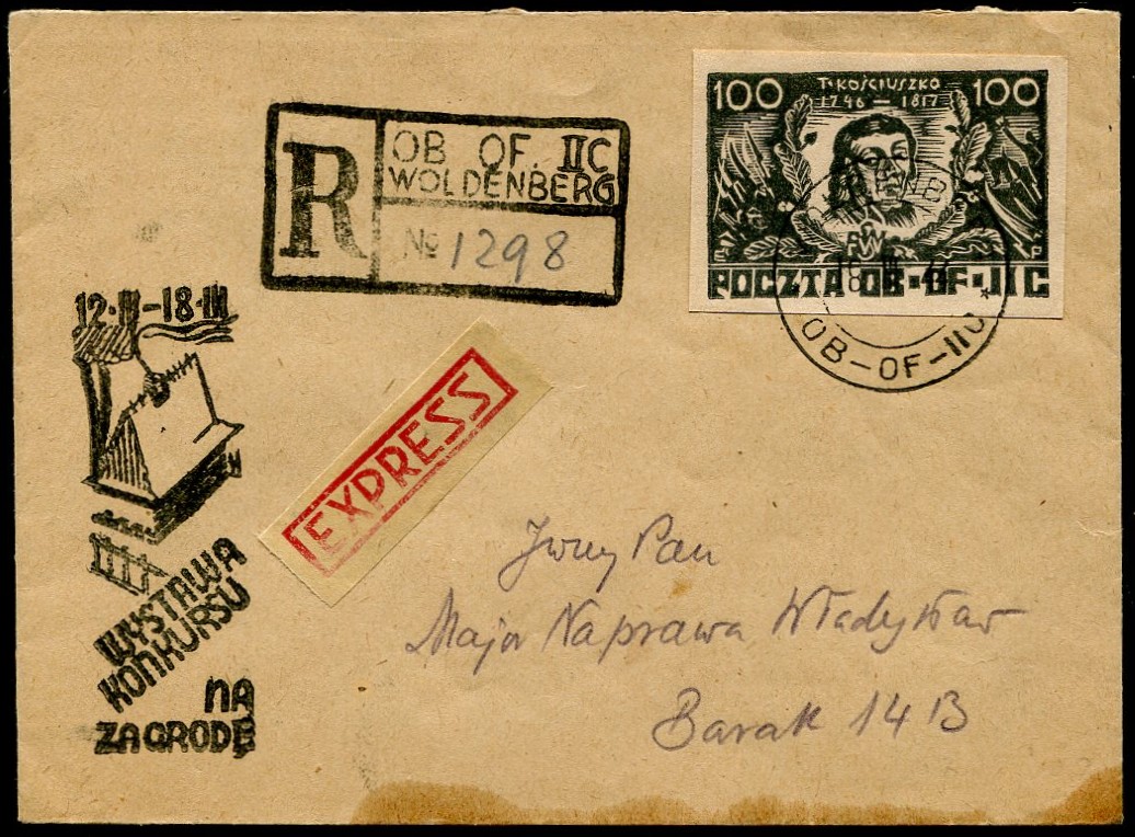 1944 150 rocznica powstania kościuszkowskiego, ekspresowy list polecony , znaczki unieważnione kasownikiem okolicznościowym "Góra św. Anny", gwarancja. | Fi.30, 37 |