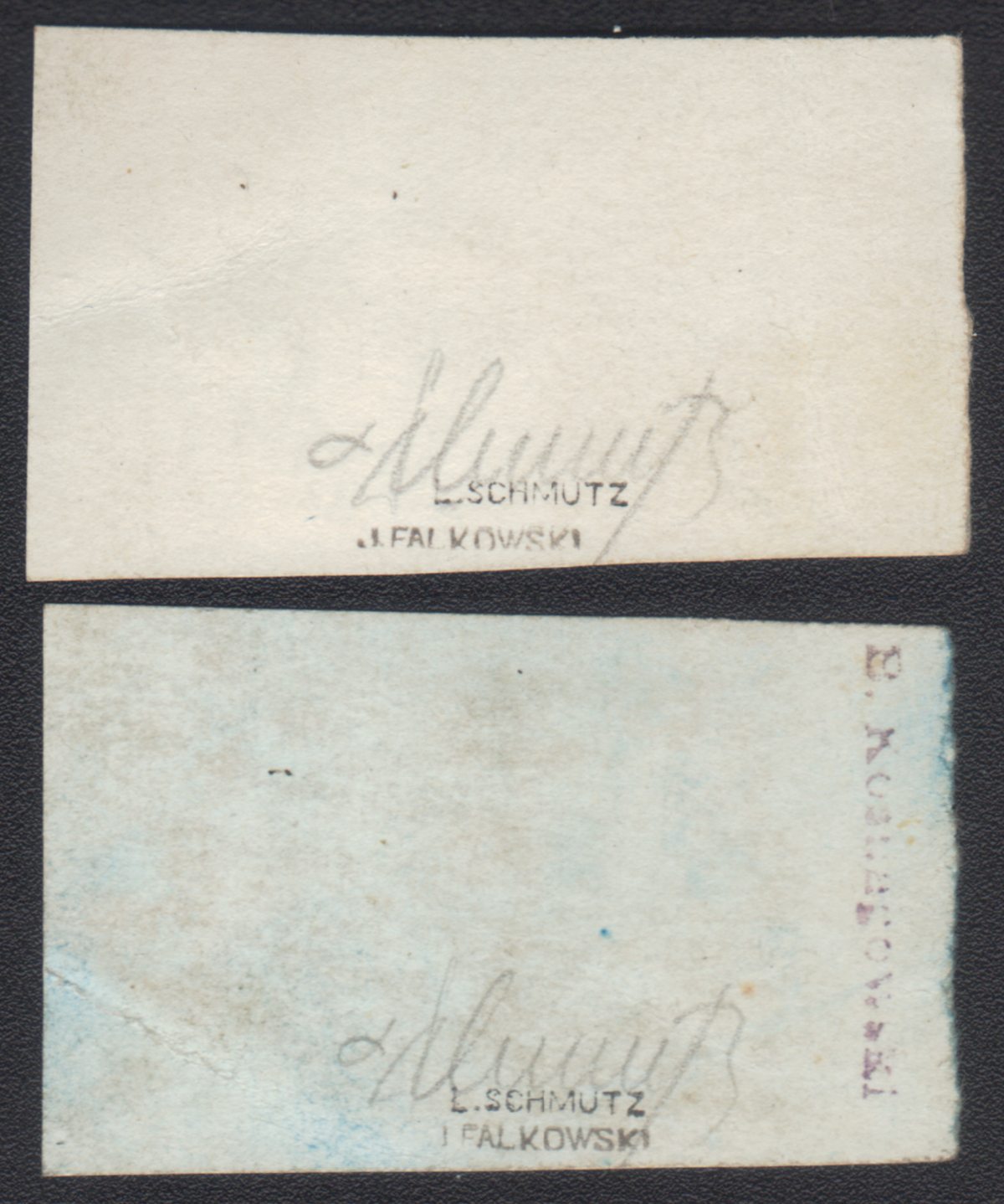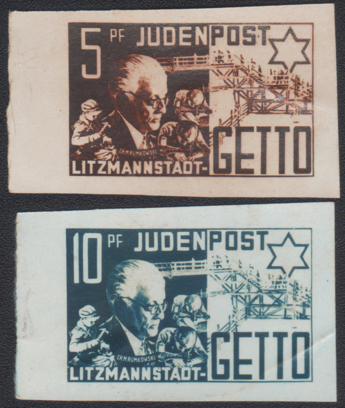 1944 Getto w Łodzi, niezrealizowane wydanie "fotograficzne" na białym grubym błyszczącym papierze; tzw. wzór II z portretem Ch.Rumkowskiego z profilu; unikalne niespotykane w tej postaci próby cięte - tak jak je wydano bez gumy, próba za 10 Pf. sygnowana E.Koszagowski z lekkim pęknięciem papieru (jak prawie wszystkie znaczki o tym nominale); obie podwójna gwarancja Falkowski i Schmutz. | Fi.IV-V nz P |