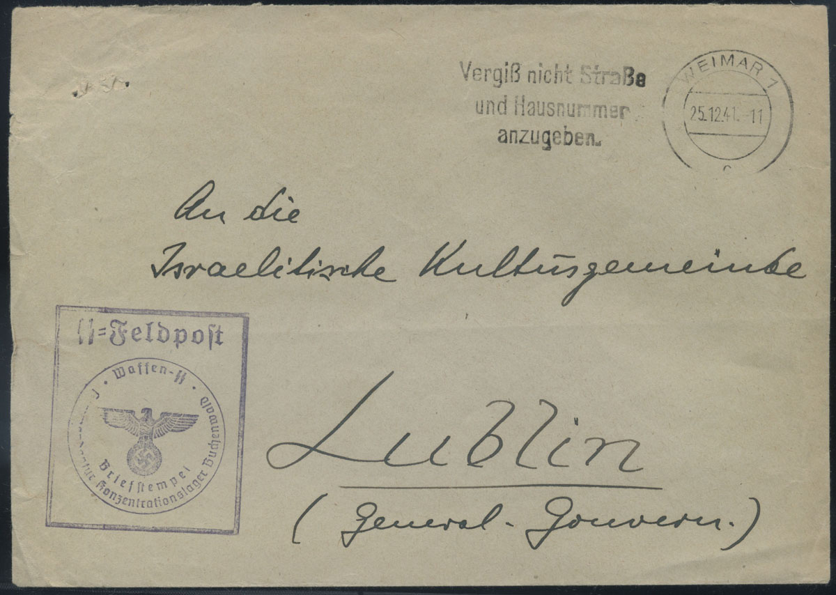 1941 Buchenwald - getto Lublin, list wysłany z komendantury obozu Weimar Buchenwald do Rady Żydowskiej (Judenrat) dzielnicy żydowskiej w Lublinie (Getto Lublin). | |