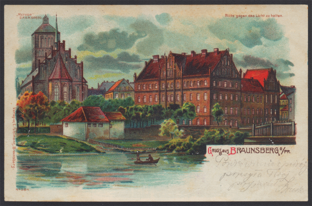 1900 widokówka Braniewo - Gruss au Braunsberg O/Pr. - litografia, dodatkowe wrażenia estetyczne pojawiają się gdy ogląda się kartę "pod światło", z obiegu; bardzo dobry stan zachowania. | |